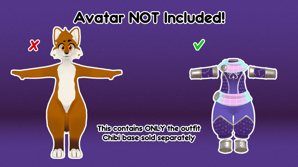 This outfit is made for the Skip4D Chibi avatar base! It is not built for, nor will I assist with, putting it onto other avatars.