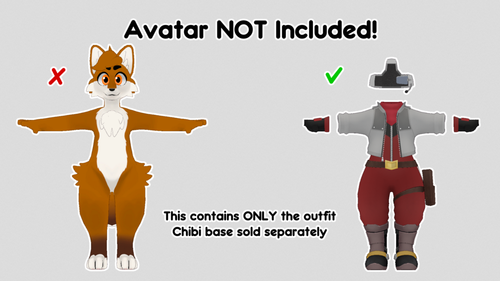 This outfit is made for the Skip4D Chibi avatar base! It is not built for, nor will I assist with, putting it onto other avatars.